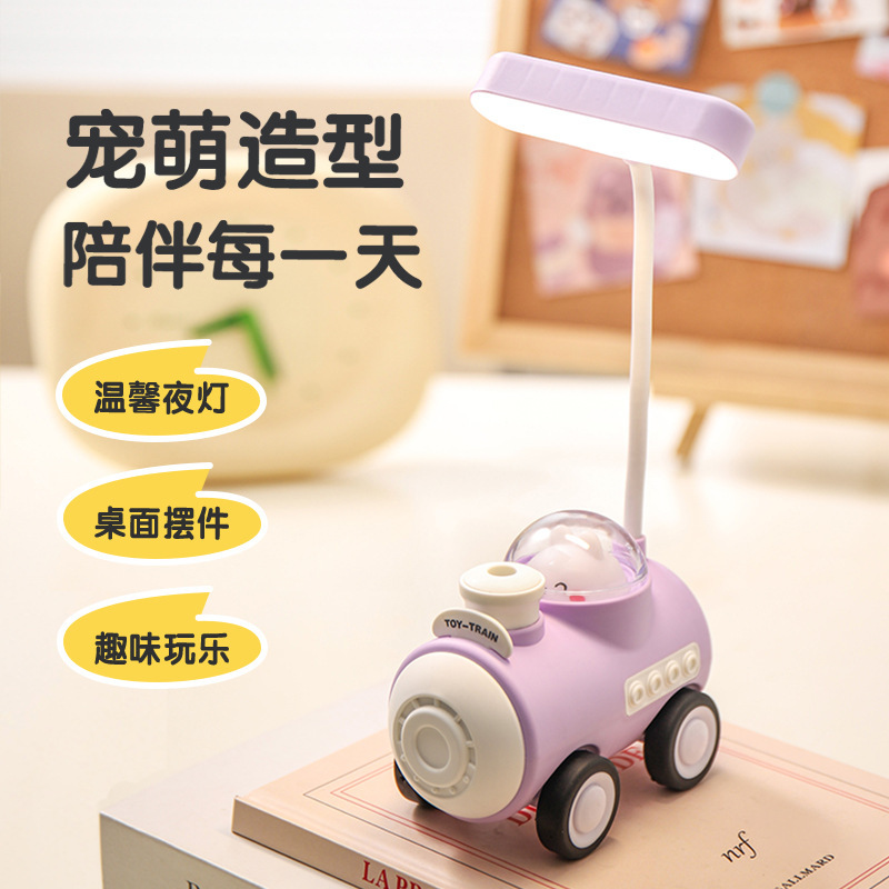 Lampu meja kereta kecil hewan peliharaan lucu, lampu baca anak pelajar dua gigi pengisian USB pelindung mata