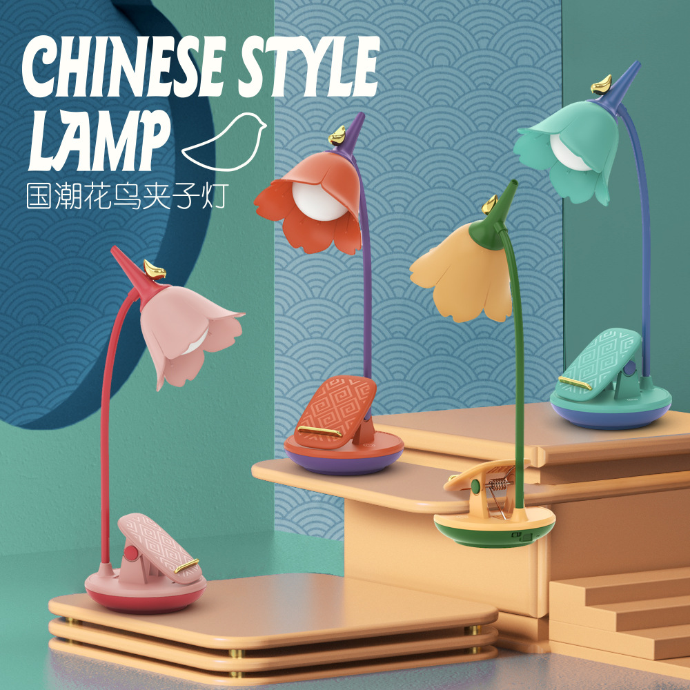 Lampu meja kecil LED redup, klip bunga dan burung kreatif Nasional kecepatan Tiga Perlindungan Mata asrama belajar pengisian daya USB