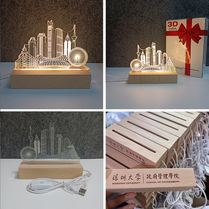 Lampu Malam Kreatif Kustom Perusahaan Hadiah Logo Perusahaan Lampu Meja 3D Kayu Solid Ornamen Aklim Souvenir Sekolah