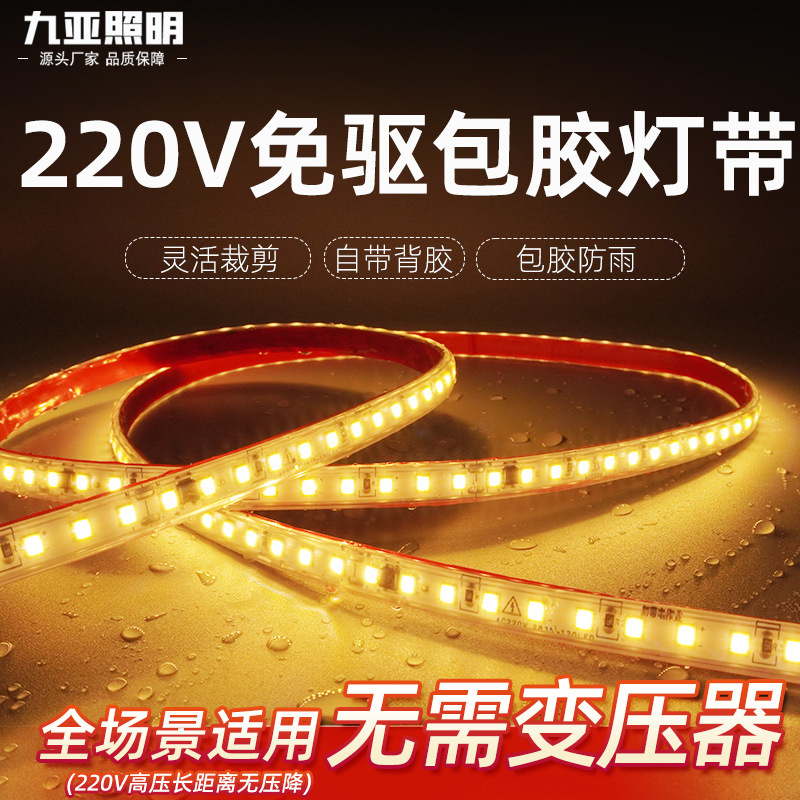 Setrip lampu dilapisi plastik antiair Super terang, setrip lampu led 220V tekanan tinggi dengan perekat, setrip cahaya lembut untuk 2835 luar ruangan rumah