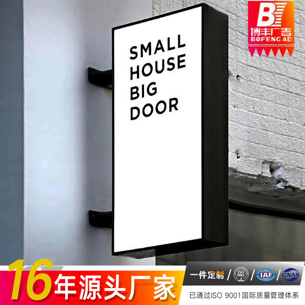 Papan iklan akrilik dua sisi, lampu LED, kotak lampu datar, seni besi lintas batas, pemasangan di dinding, pemasangan samping