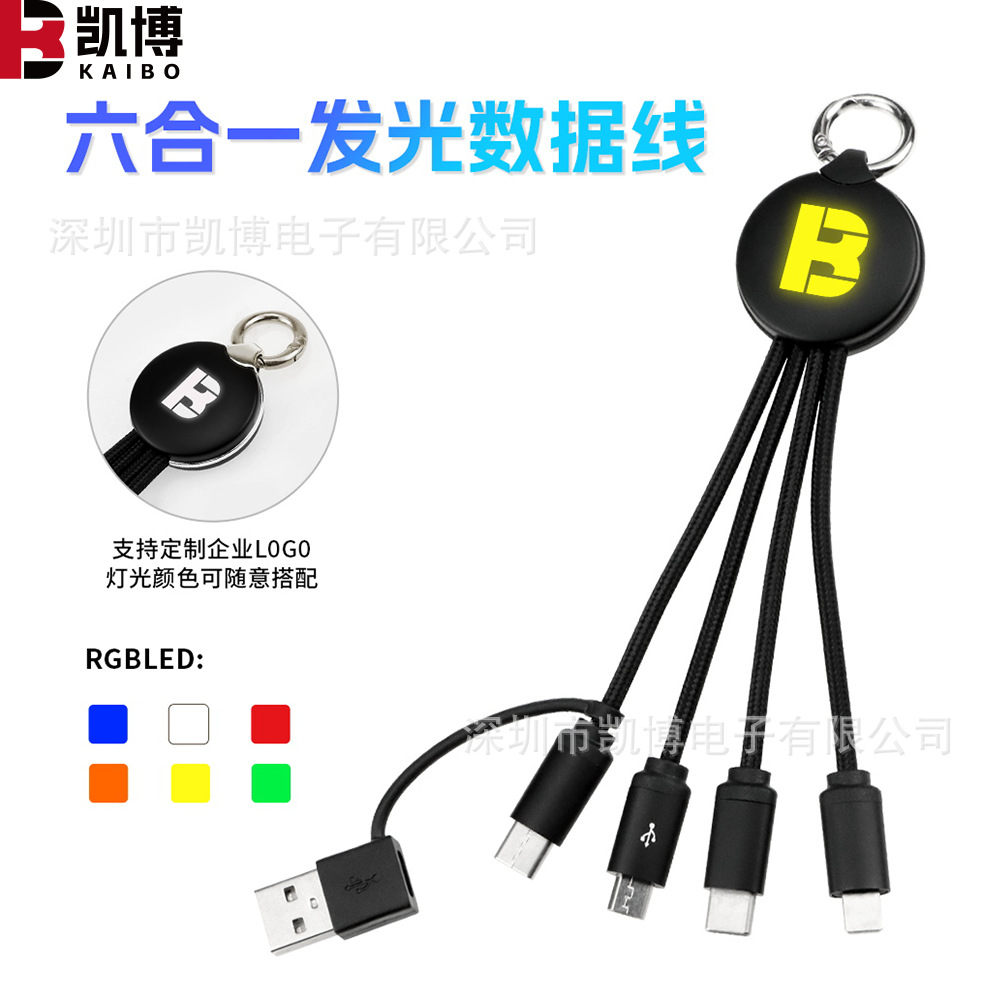 Kabel data pengisi daya ponsel LOGO bercahaya dua tarik tiga LED input ganda kabel data hadiah logo transparan enam-dalam-satu