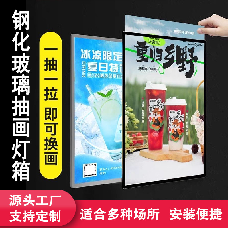 Kotak lampu kaca untuk iklan di kedai minuman teh susu, dipasang di dinding untuk menampilkan menu restoran, gambar dapat diganti, kotak lampu LED yang dipasang di dinding.