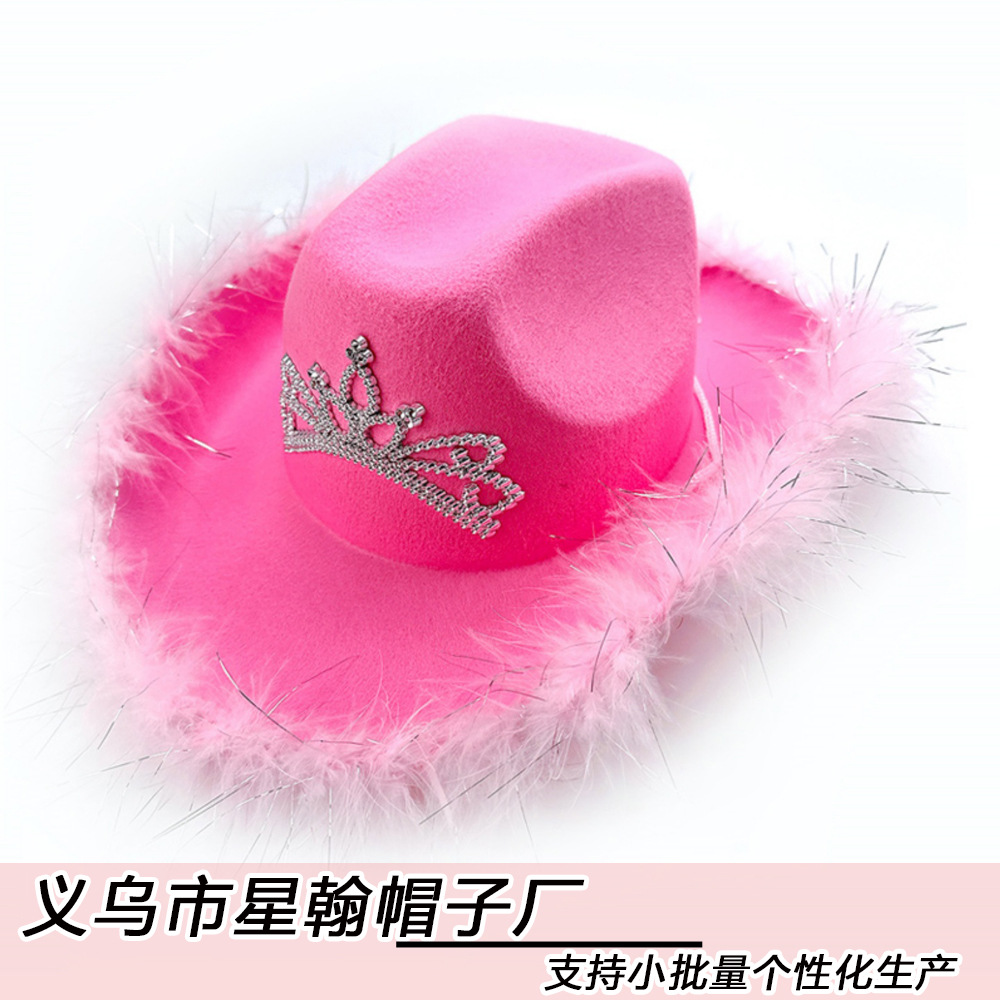Topi Denim mahkota merah muda Burr topi Denim Barat topi bulu poliester kain terasa berpayet tepi merah muda membentuk
