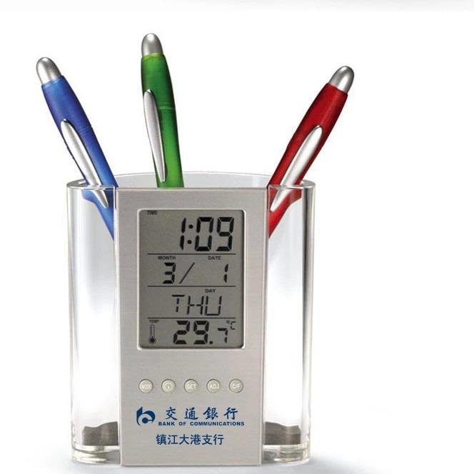 Pemegang pena transparan multifungsi, pemegang pena kalender elektronik LOGO dapat dicetak tampilan jam, alat tulis kantor hadiah