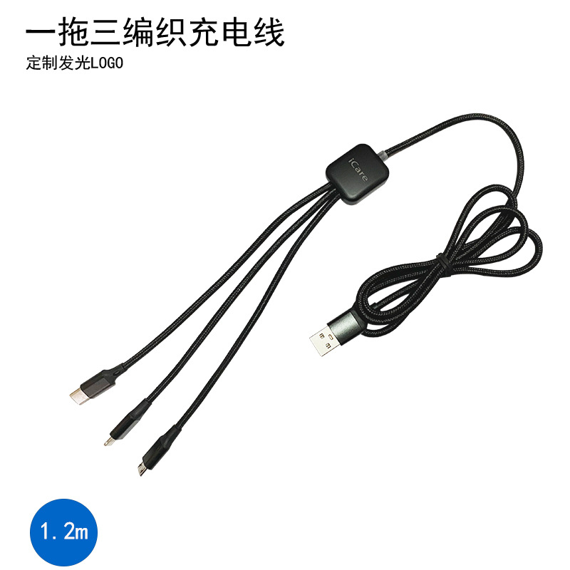 Kabel data ponsel pengisian daya cepat satu per tiga tenun tiga-dalam-satu kabel pengisian daya LOGO bercahaya LED pabrik grosir