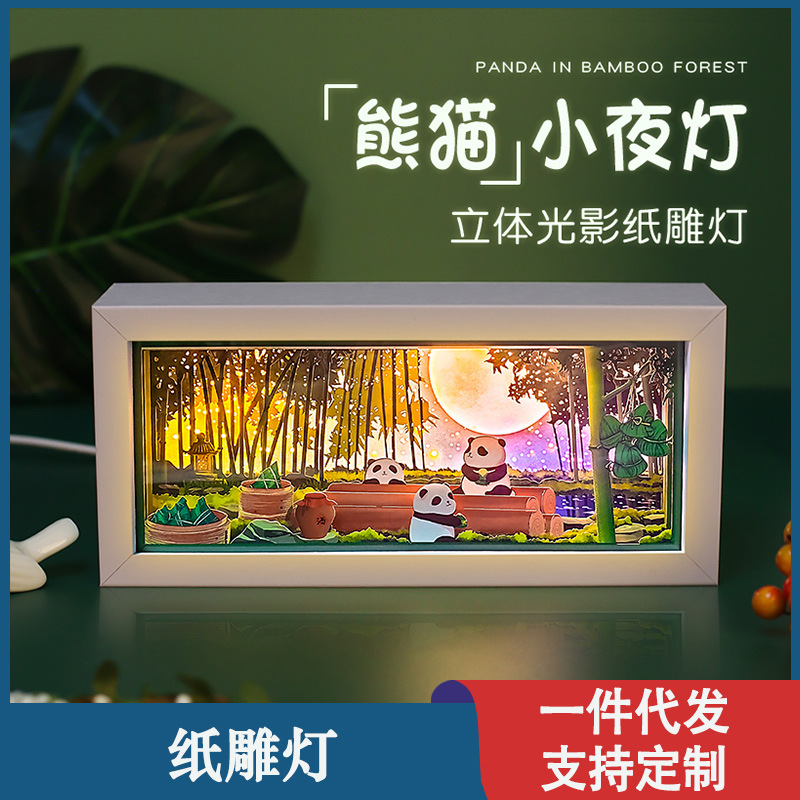Lampu ukiran kertas, hadiah disesuaikan mode nasional kreatif 3D stereo cahaya dan bayangan kartun naga perahu Festival lampu malam Panda hadiah dekorasi siswa