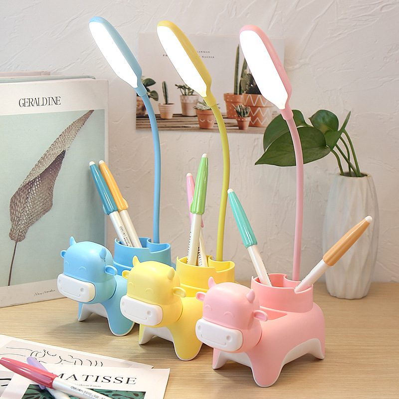 Lampu LED anak-anak, kartun hewan babi sapi gajah pemegang pena lampu meja 3 gigi lampu lipat pengisian daya lampu malam hadiah anak-anak
