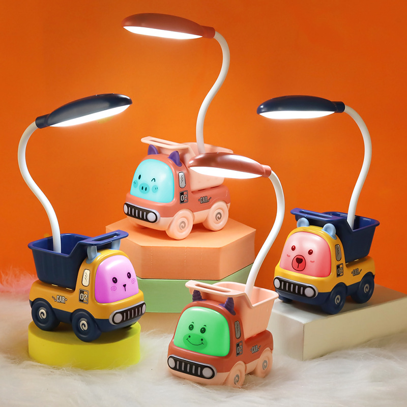 Pemegang pena LED kendaraan teknik kartun, lampu meja LED anak-anak, pelindung mata kereta kecil, lampu malam, lampu suasana, hadiah siswa