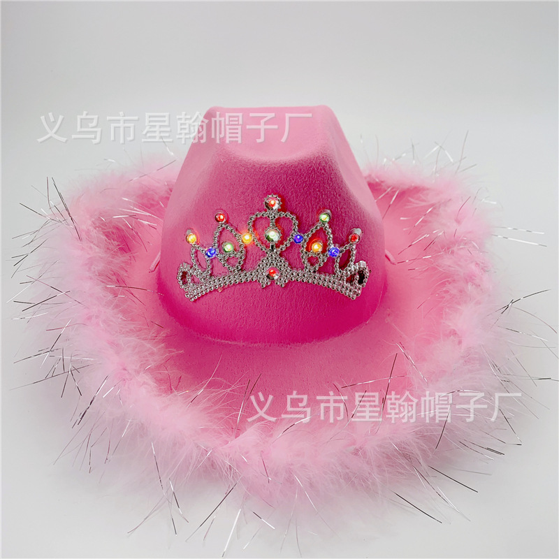 Mahkota merah muda dengan lampu bercahaya LED warna-warni topi koboi Barat flanel tertutup bulu pesta karnaval Halloween