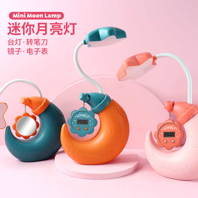 Lampu meja pena LED kartun bulan baru lampu meja dengan jam Cermin pensil rautan pengisi daya siswa lampu malam logo cetak