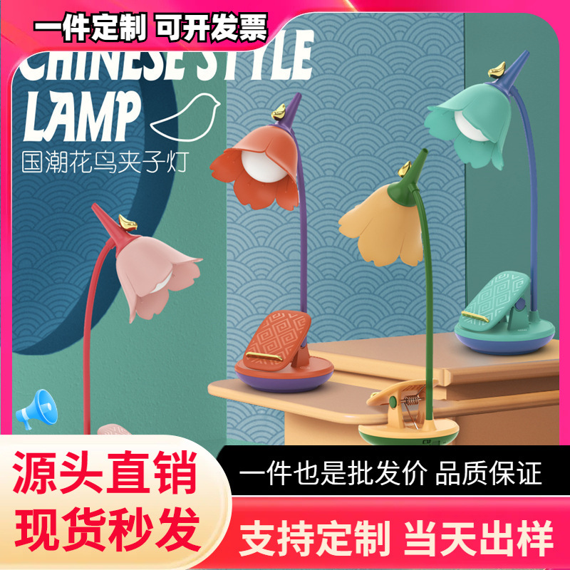 Lampu meja klip burung dan bunga, lampu meja sederhana gaya nasional dapat diisi ulang, lampu malam LED isi ulang daya sentuh peredupan