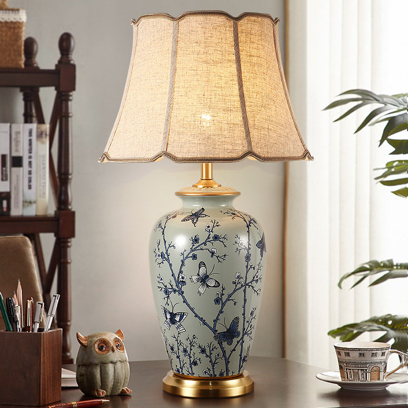 Lampu meja keramik semua dari tembaga, lampu meja dekoratif besar untuk hotel, Vila, bunga dan burung, lampu meja keramik