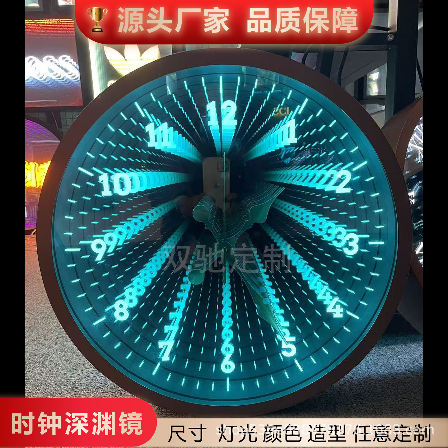 Cermin tak terbatas dengan huruf bercahaya, kotak lampu cermin berlapis ribuan, dinding latar belakang LED, lampu neon, ubin lantai panggung bar KTV, tanda-tanda bercahaya.