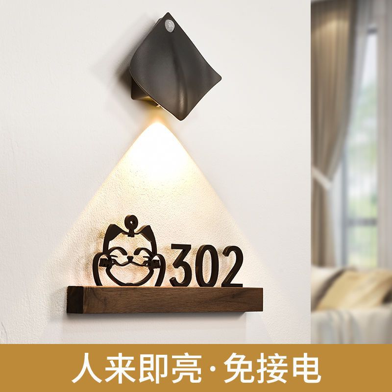Lampu sorot LED pelat rumah akrilik lampu sorot kayu solid papan reklame induksi cerdas gantungan dinding produksi lampu malam