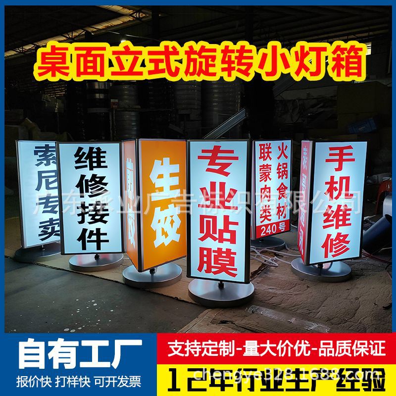 Kotak lampu vertikal pabrik langsung toko desktop meja tiga sisi berputar LED cetakan bercahaya gambar papan pengumuman tampilan