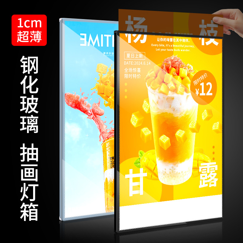 Kotak lampu LED ultra tipis untuk konter kedai minuman susu, papan display pemesanan A3A4, kotak lampu vertikal tarik keluar dengan kaca tempered.