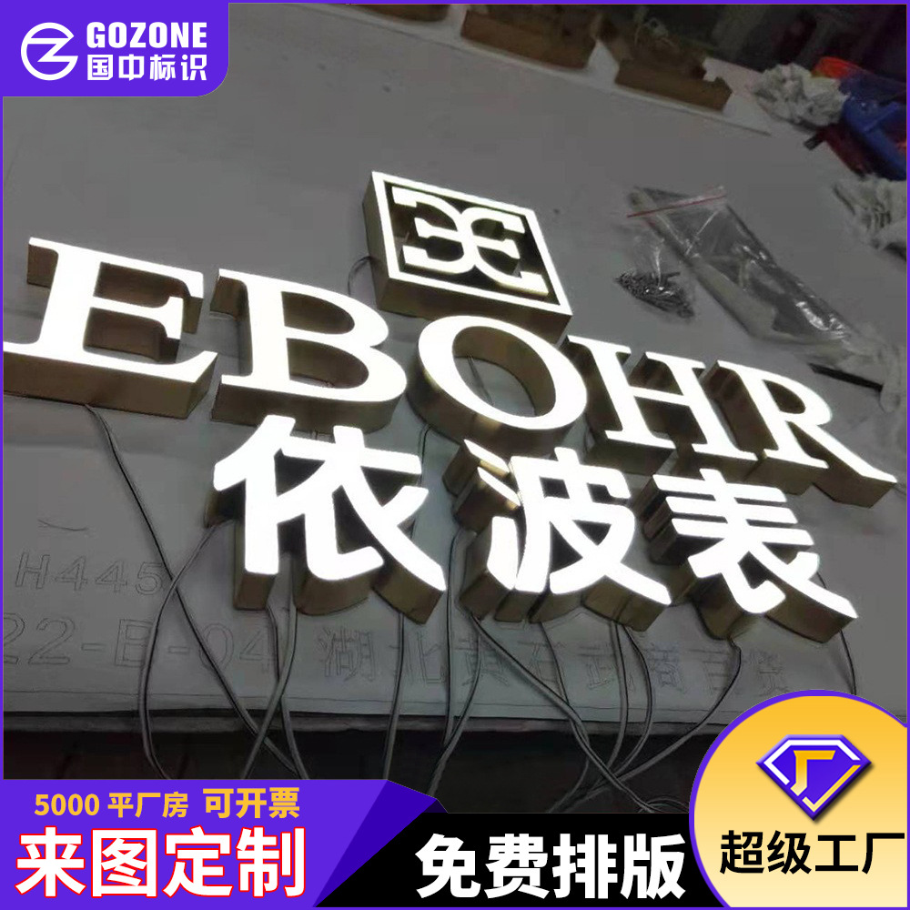 Butik langsung pabrik lampu belakang baja tahan karat LED karakter bercahaya Kristal titanium pintu bawah iklan papan sirkuit