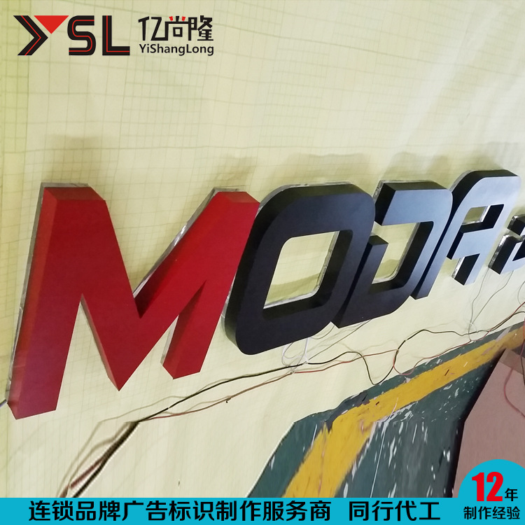 Pintu kepala cat besi tahan karat kristal bawah belakang karakter bercahaya logam titanium lampu belakang kepala pintu papan iklan produksi bercahaya