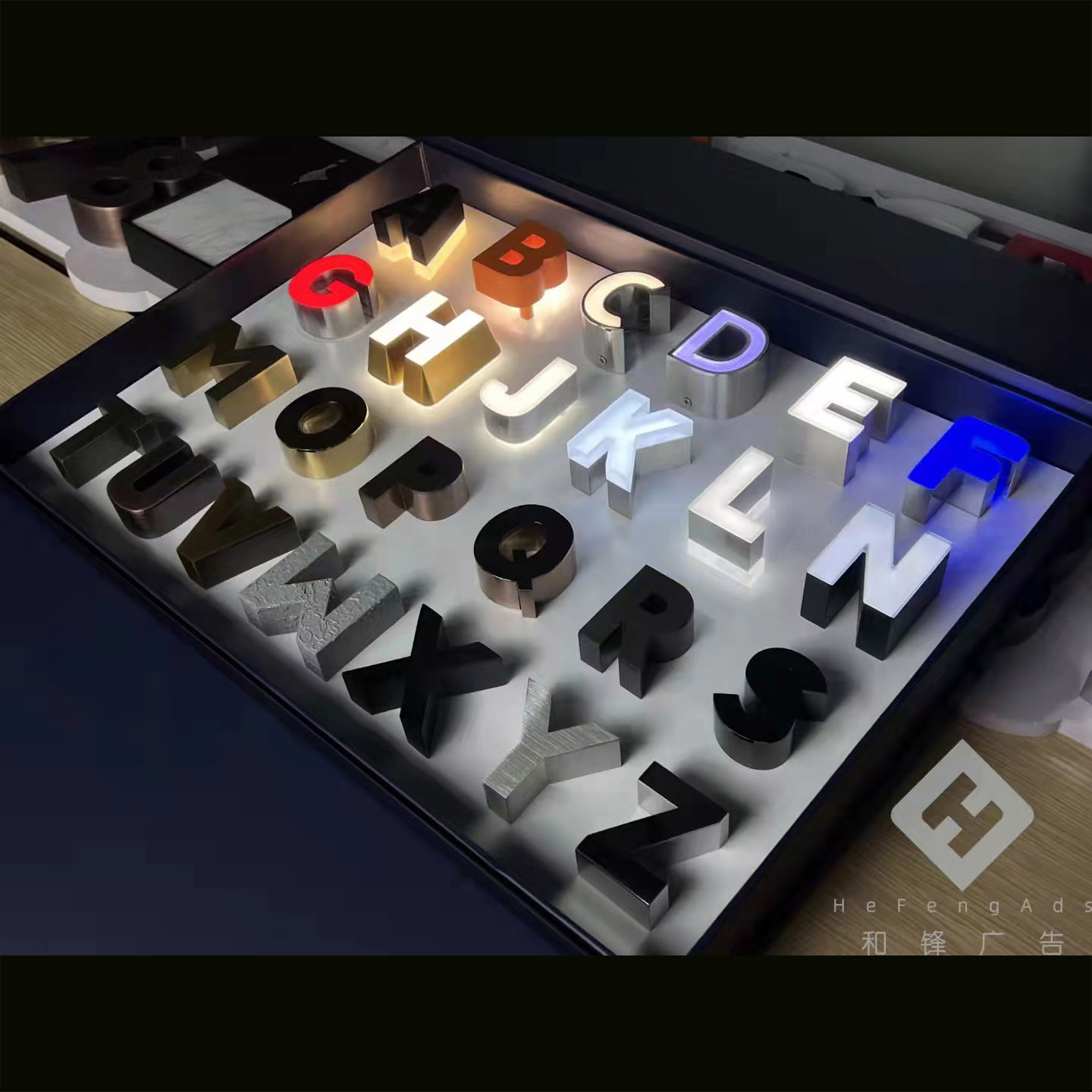 Papan nama baja tahan karat, huruf resin dengan lampu latar, papan nama, huruf mini logam tiga dimensi.