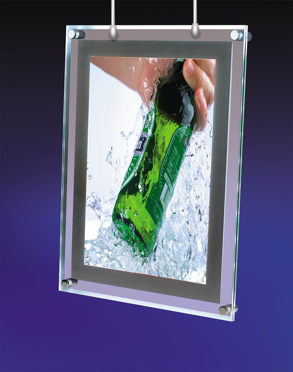 Layar lightbox bercahaya dua sisi untuk pajangan jendela, tanda display LED gantung, tanda iklan gantung ultra-tipis.