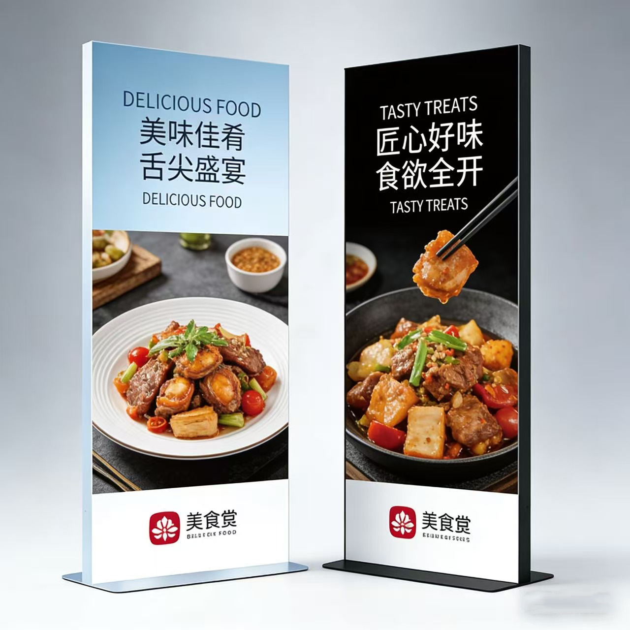 Kotak lampu pengisi daya vertikal ponsel luar ruangan papan nama toko led papan reklame bercahaya sisi ganda lantai khaki film lembut UV
