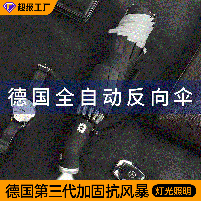 Kain bumper otomatis penuh, payung penahan matahari led45 derajat berputar mundur, payung cerah hujan mundur, logo payung dapat ditambahkan