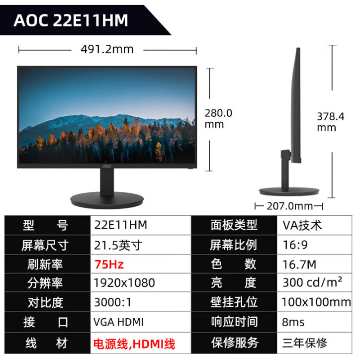 AOC 22E11HM 21.5 inch VA tampilan lebar kantor rumah 100Hz dukungan hiasan dinding cocok