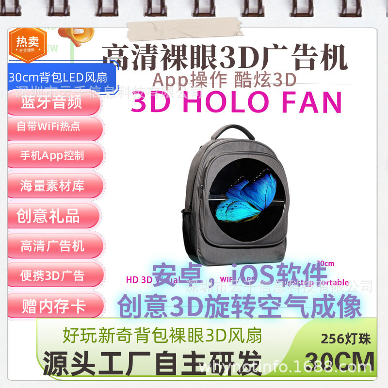 Ransel 30cm 3D mesin iklan holografik ransel LED layar iklan berjalan mata telanjang 3D ransel kipas holografik