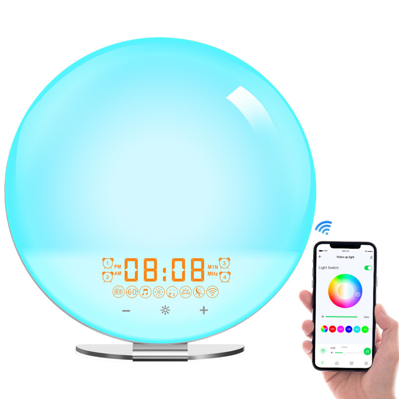 Pabrik model pribadi aplikasi pintar alami bangun WiFi suara jam alarm radio FM LED warna-warni lampu malam samping tempat tidur