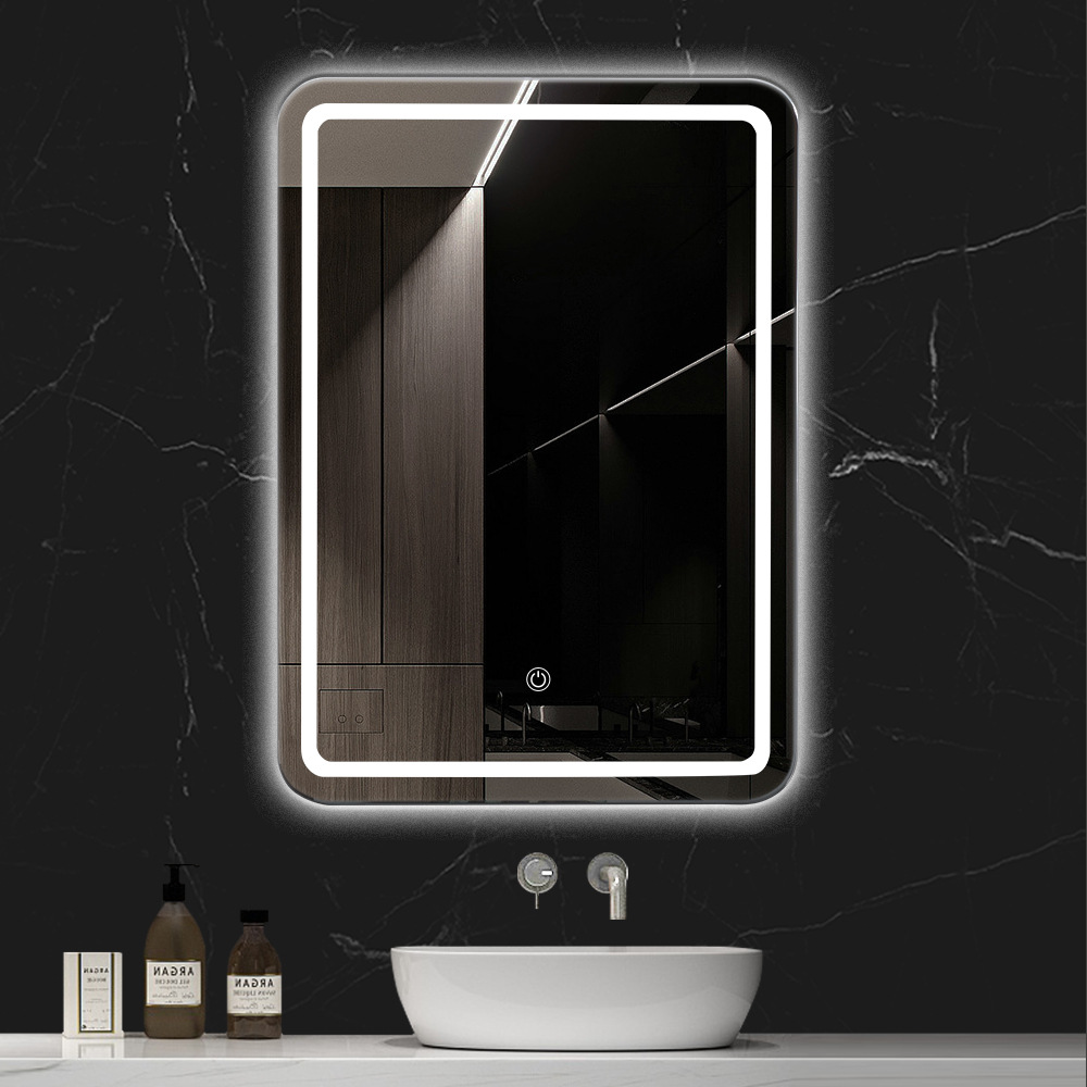 Cermin kamar mandi LED, cermin kamar mandi layar sentuh bercahaya cermin pintar dejigging dengan cahaya rias gantungan dinding kamar mandi persegi