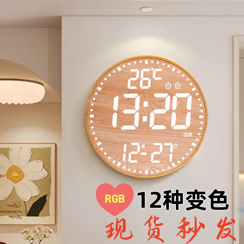 Jam Dinding Ruang Tamu Multifungsi Digital Cerdas 12 Inci Jam Kalender Bamboo RGB Warna Fantasi Jam Alarm Tunda Elektronik