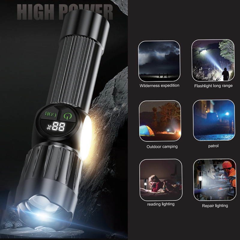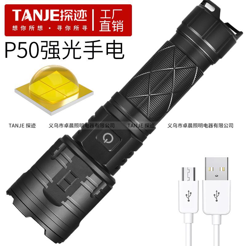 Senter LED zoom tampilan daya tahan lama, lintas batas baru P50 cahaya kuat tahan air luar ruangan pengisian USB