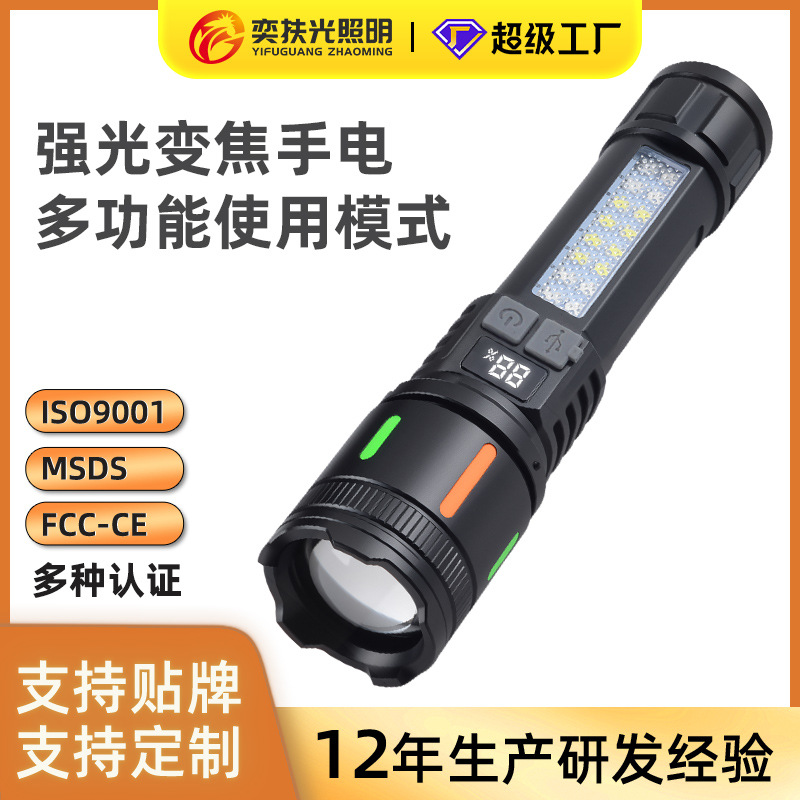 Senter LED luar ruangan, lampu senter LED Kuat P50 pengisian daya USB baru lintas batas dengan lampu samping COB magnet