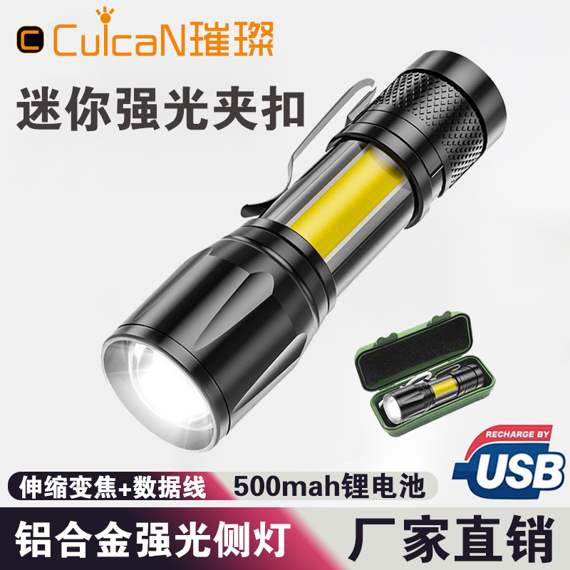 Senter kecil LED, dengan lampu samping COB cahaya kuat zoom teleskopik setelan pengisian USB senter mini 511