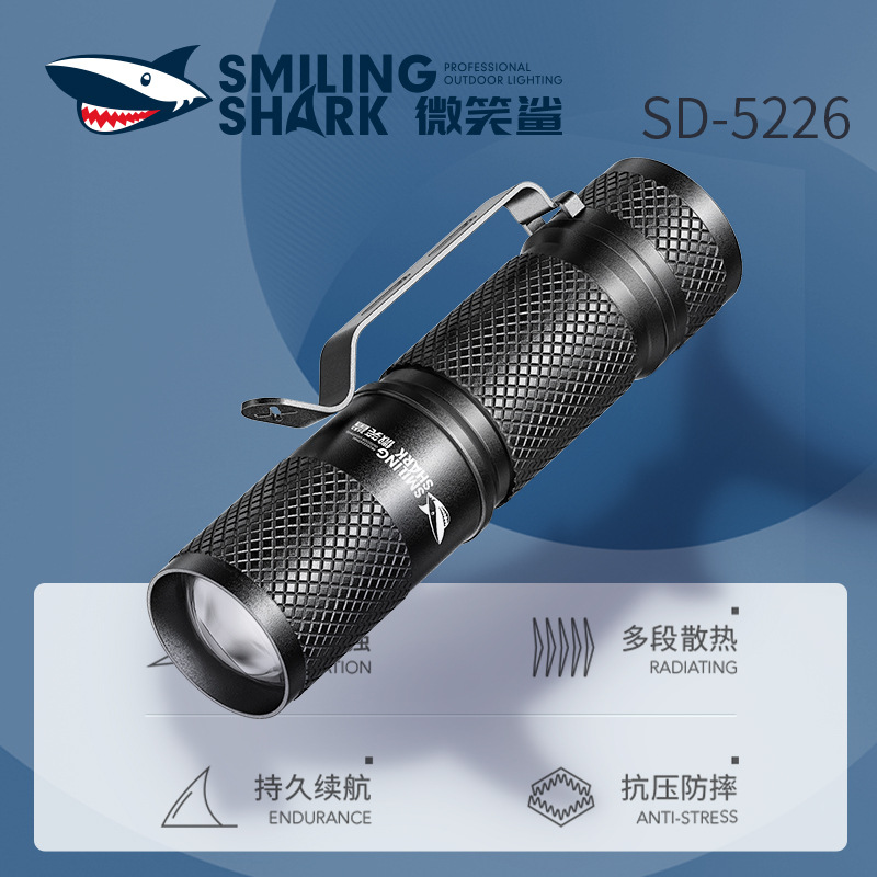 Senter teleskopik tahan air, senter hiu tersenyum, tahan air, paduan aluminium, fokus teleskopik dengan klip pena, senter luar ruangan, lampu kuat