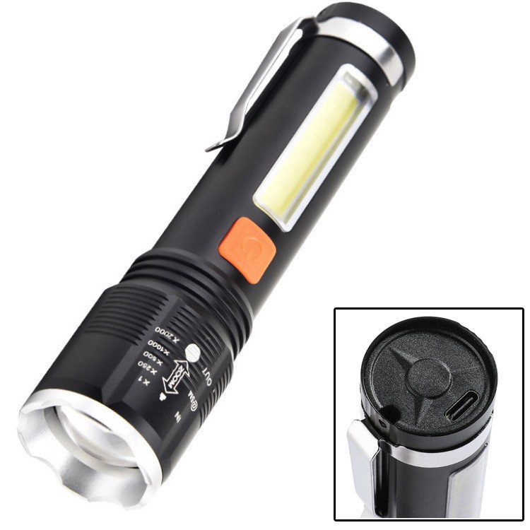 Senter LED lintas batas USB, dapat diisi ulang untuk berkemah luar ruangan dengan tampilan daya lampu samping, senter kecil plastik