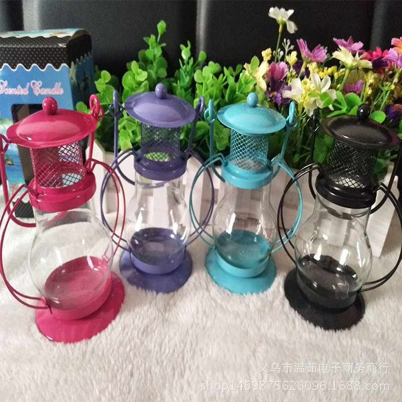 Lampu lilin kaca besi dekorasi renda strip Shandong kaca kerajinan lampu portabel aksesoris cap logam