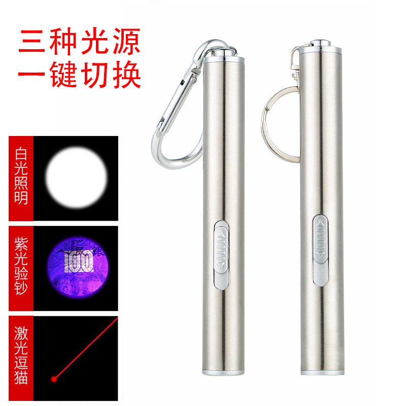 Senter Mini 395nm lampu ungu detektor uang, lampu laser inframerah baja tahan karat lampu tiga dalam satu lampu bulan