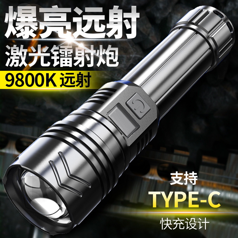 Senter LED isi ulang dengan cahaya kuat dan sinar laser, jangkauan jauh, super terang, dapat diisi ulang, senter tahan lama.