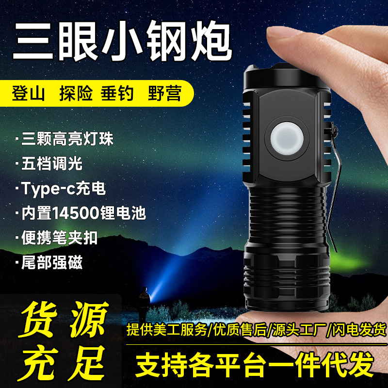 Senter tiga mata luar ruangan, lampu kuat dapat diisi ulang untuk luar ruangan super terang tembakan panjang kecil mini portabel rumah tangga senter kecil