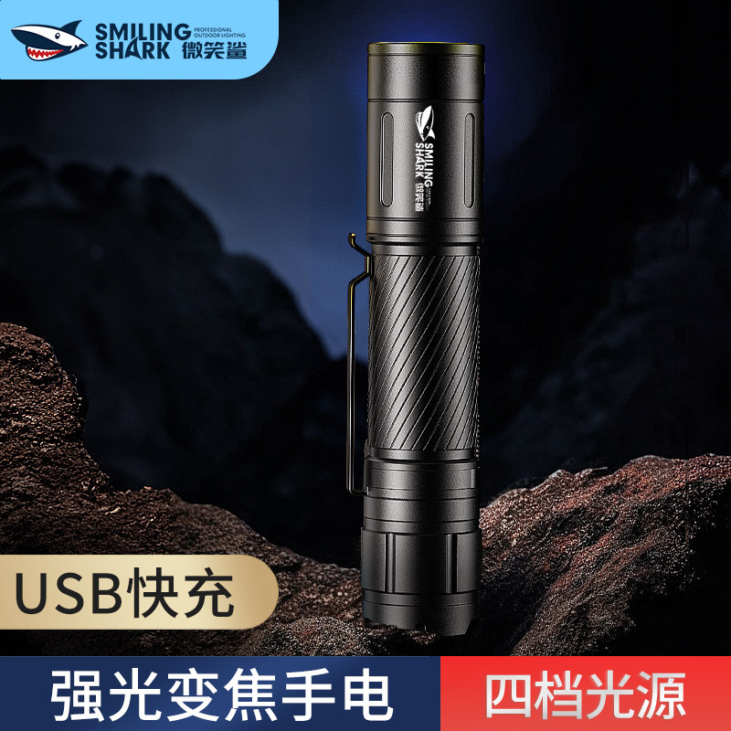 Senter terang mini luar ruangan, hiu tersenyum, tahan lama, pengisian cepat USB, fungsi penyesuaian multi-gigi