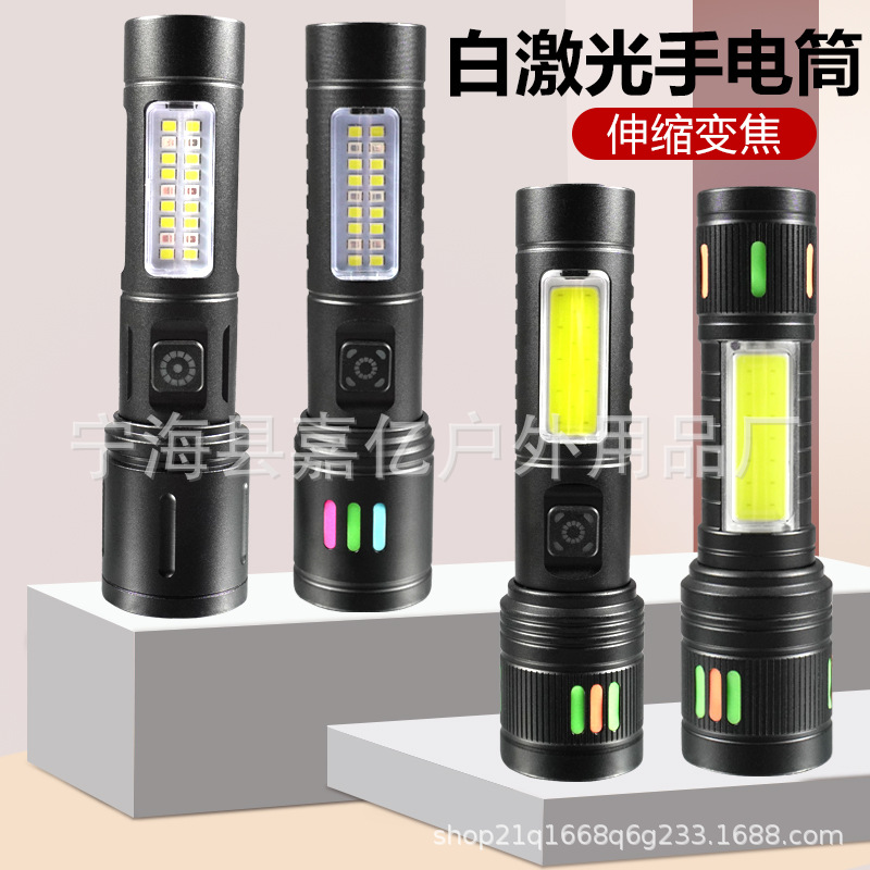 Laser putih baru pengisian daya USB portabel multi-fungsi paduan aluminium teleskopik pengisian daya cahaya yang kuat senter tiga warna