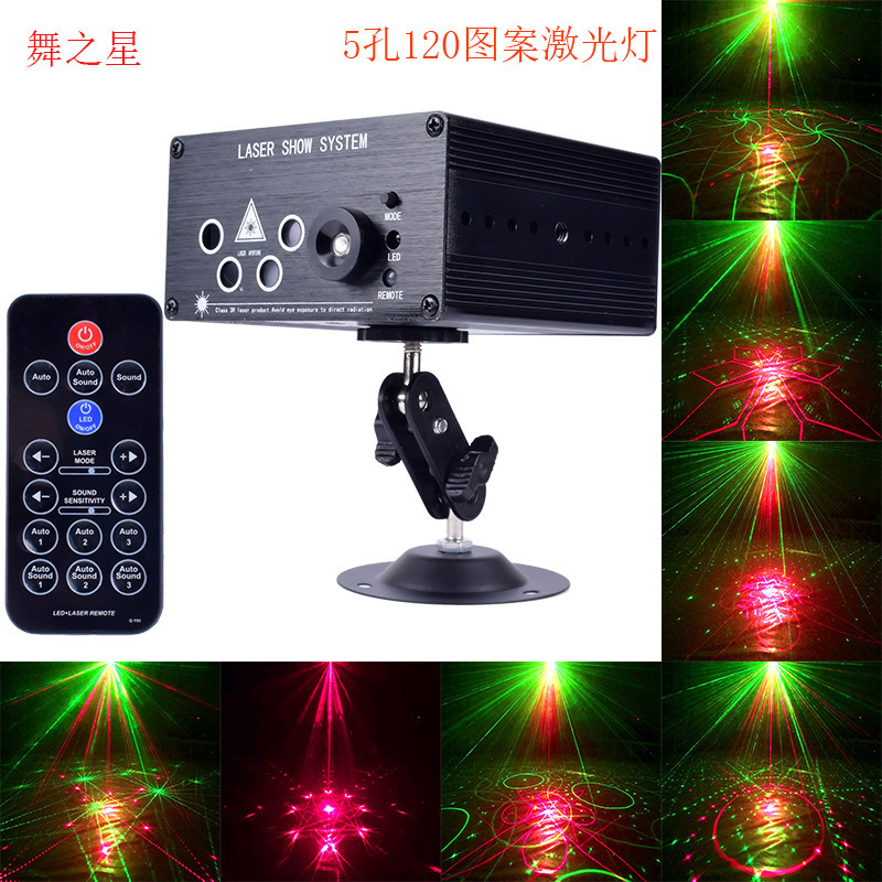 Penjualan langsung pabrik 5 lubang 120 pola laser cahaya led kontrol suara berputar merah biru hijau lampu panggung mini pengendali jarak jauh
