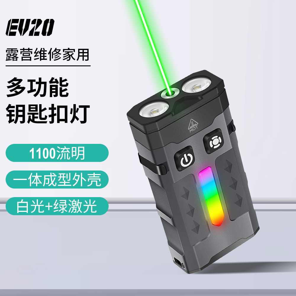 Senter laser EV20 cahaya kuat warna-warni RGB lampu ambient tiga-dalam-satu gantungan kunci EDC lampu portabel genggam