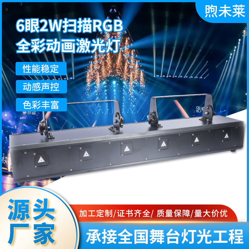 Daya tinggi 6 mata 2W pemindaian RGB warna penuh lampu laser animasi lampu panggung laser bar DMX pemindaian lampu 3D