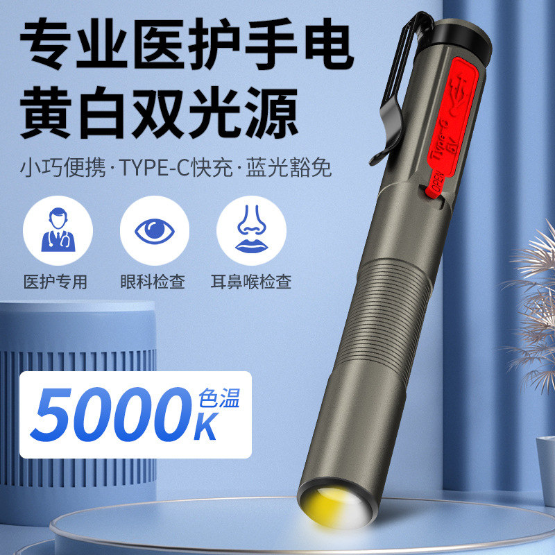 Senter pelindung mata lampu kecil kuat, super terang luar ruangan tembakan panjang pena pengisi daya lampu LED kuning putih identifikasi pencahayaan