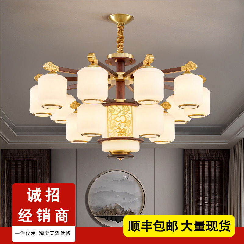 Lampu Gantung Ruang Tamu Kayu Walnut Tembaga Gaya Tiongkok Baru Tahun 2025 Lampu Ruang Makan Gaya Tiongkok Model Baru Lampu Fuluo Double Lobi