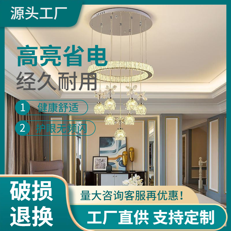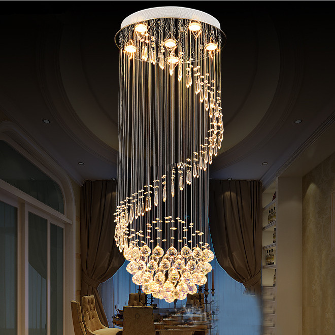 Lampu kristal panjang kristal, lampu ruang tamu bulat, lampu gantung kristal panjang, lampu gantung dupleks, kawat sutra, lampu gantung Spiral