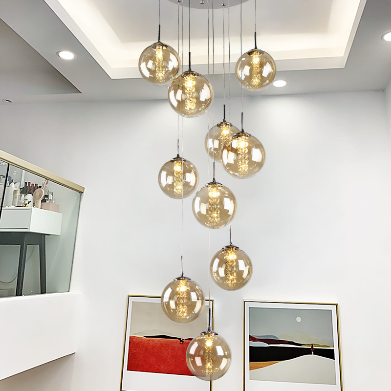 Lampu tangga lampu gantung panjang modern minimalis cahaya mewah besar villa kecil dupleks bangunan loteng berlubang ruang tamu lampu kristal